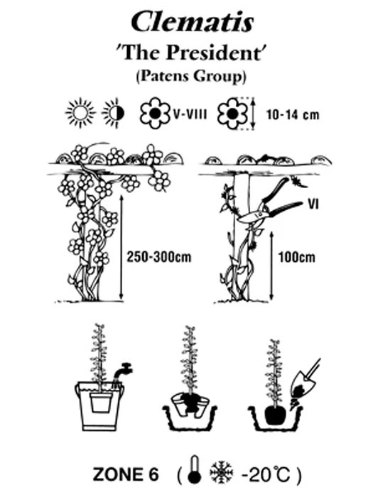 Clematis ‚The President‘ ist eine herrliche violettblaue Sorte mit großen leuchtenden Blüten.