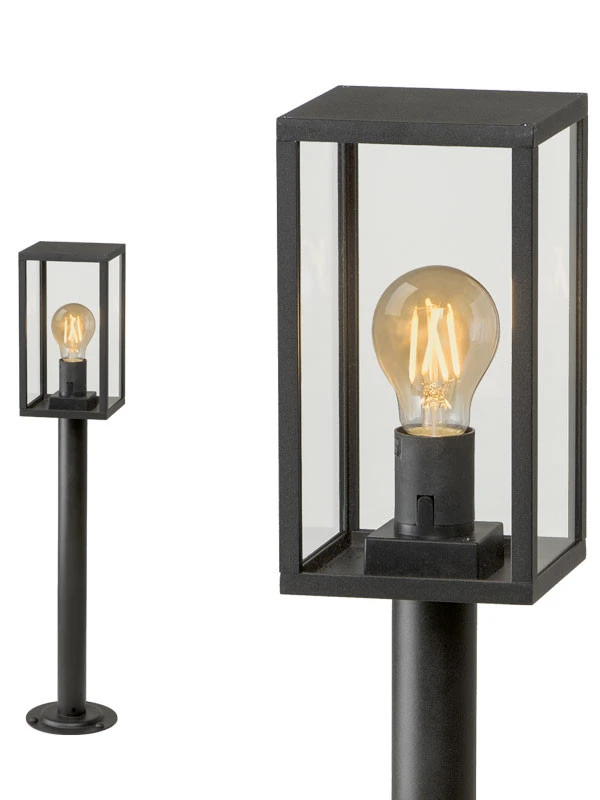 Das moderne Laternen-Design lässt sich sowohl im moderne als auch in klassische Gartenambiente einbringen. Diese Standleuchte ist in 2 Höhen erhältlich
