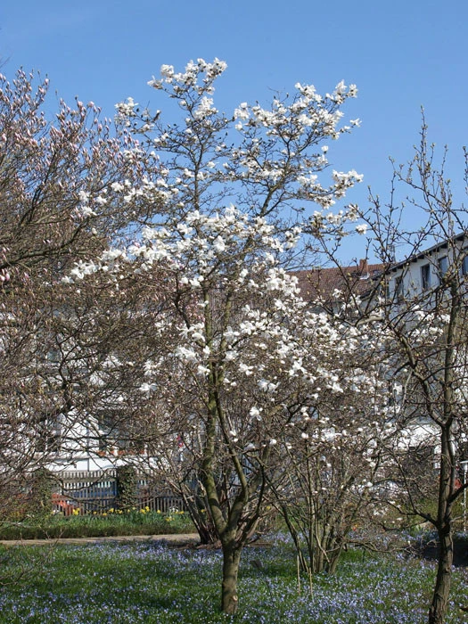 Die Magnolia loebneri ‚Merrill‘ (Große duftende Sternmagnolie) blüht so intensiv wie kaum eine andere Magnoliensorte. Die ab Ende April erscheinenden weißen Sternenblüten sind im Vergleich zu anderen Magnolien relativ unempfindlich gegenüber Frost.