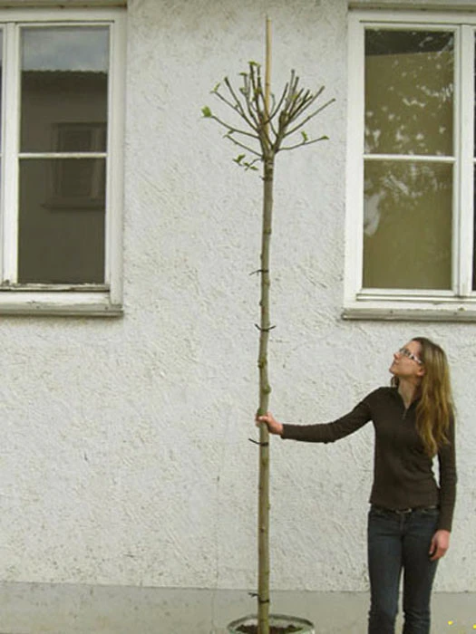 | Lieferqualität: | Junger Hochstamm mit einer Stammhöhe von ca. 2,20 m im Container. Mit einer auf dem Stamm aufsitzenden kleinen Krone, die im Lieferzustand fachgerecht etwas zurück geschnitten ist, um eine gute Kronenentwicklung nach der Verpflanzung zu gewährleisten. Stammhöhe: ca. 2,20 m |